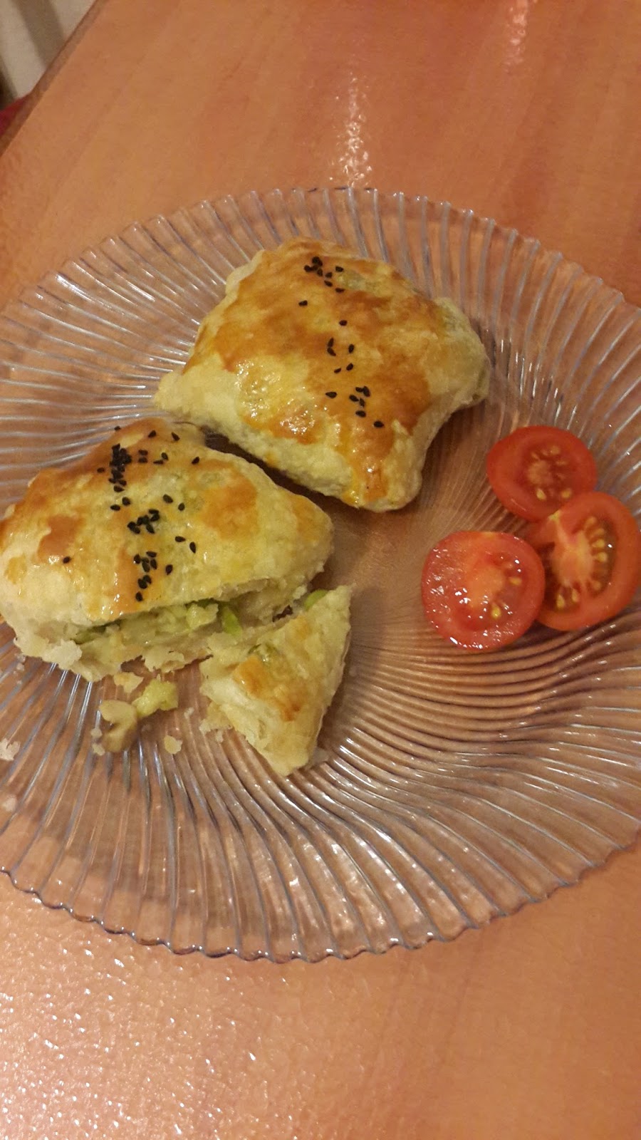 Milföy hamurunu merdane ile biraz açarak genişletin ortasına sebze karışımını koyup bohça gibi kapatın tepsiye dizip üzerine çırpılmış yumurta sarısı sürüp çörek otu serpin önceden ısıttığınız fırında 170 derecede üzeri kızarıncaya kadar pişirin